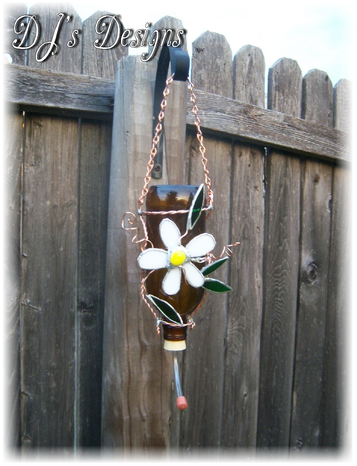 This is one of the classes I wanted to do ... make a humming bird feeder...it is really a cage that holds a bottle to make it a humming bird feeder....this is my freinds common old brown beer bottle. I thought it would look good with the copper wires ...So I proceeded...